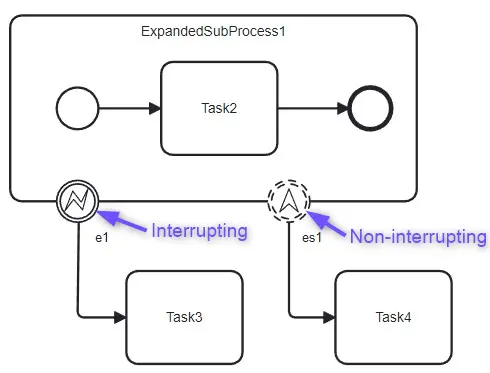 Function: Boundary events can interrupt the ongoing activity (Interrupting Boundary Event) or allow the Activity to continue while reacting to the Boundary Event (Non-interrupting Boundary Event).