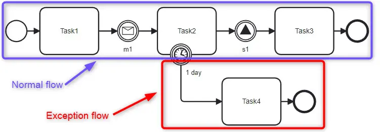 Intermediate Boundary Events, on the other hand, are associated with Activities and are attached to the boundary of those Activities. They are used to either interrupt or react to exceptions, such as errors, timeouts, or cancellations that occur while an Activity is in progress.