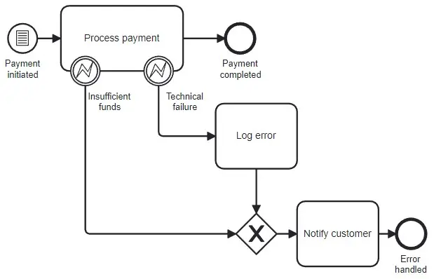 2. Error Handling in Payment Processing: Consider a payment process where an attempt to process a payment may result in an error (e.g., insufficient funds, technical failure). An Error Boundary Event attached to the payment Task can capture the error and redirect the flow to an error-handling process. This interrupts the payment Task, stops the attempt, and ensures that an appropriate fallback (e.g., notifying the customer) takes place, providing a smooth error-handling mechanism.
