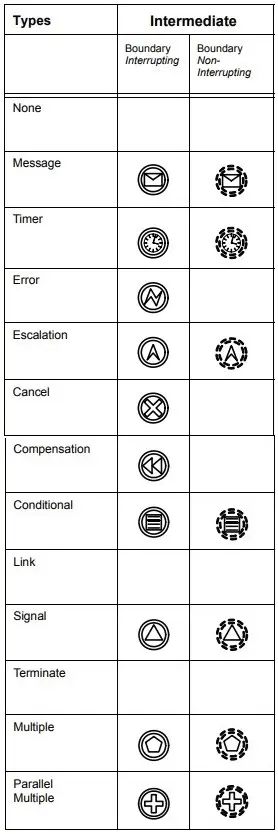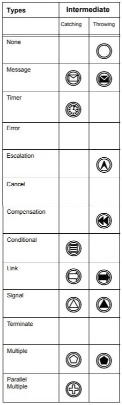 Intermediate Events can be represented as an empty circle (None Events) or with an optional marker inside. This marker can be filled or unfilled depending on whether it is a Throwing or Catching Event. The following simplified table, created based on Table 10.93 from the BPMN specification, contains all the possibilities.