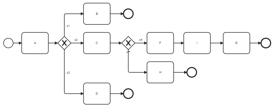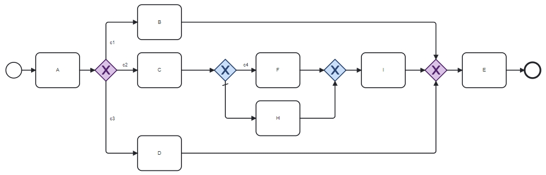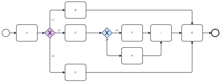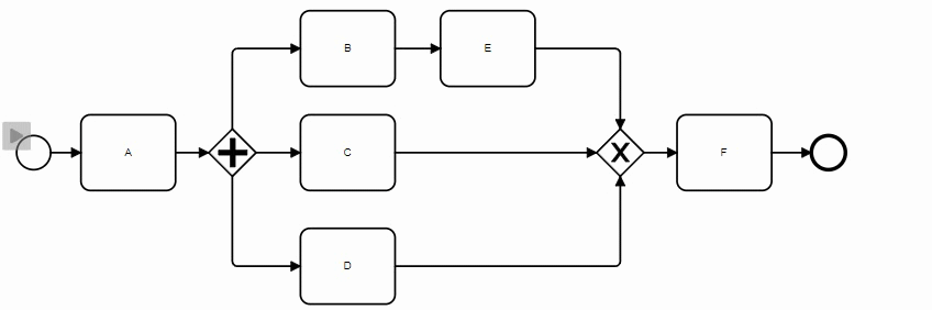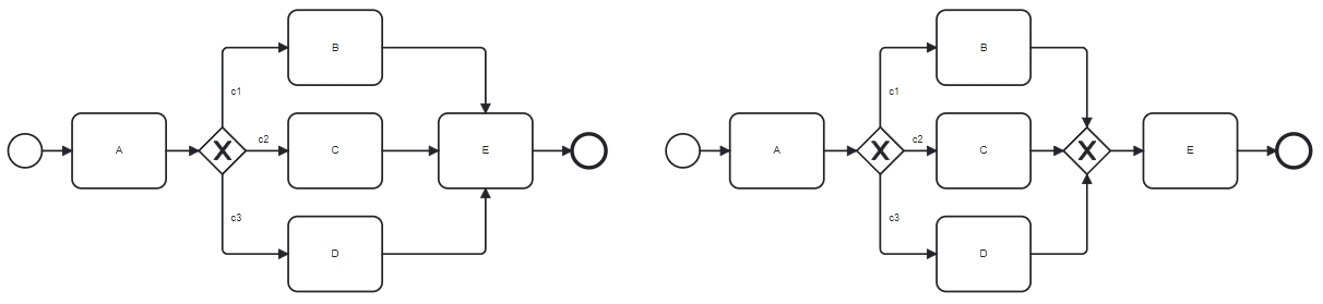 When you draw one, it looks like a diamond with or without an “X” (just like the exclusive split gateway). By default, however, BPMN does not require an explicit merge for exclusive flows - if two or more branches are truly alternative, the first one to arrive continues the process and the other branches never produce a token.