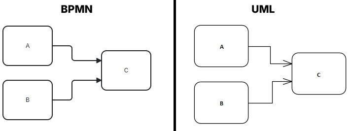 There is one more trap. If you skip the XOR-join and just draw multiple arrows into an activity, a person experienced with UML activity diagrams may misread this. In UML, multiple incoming flows are interpreted as a join (synchronization) - meaning “wait for all incoming flows” - while in BPMN an implicit reconnection does not synchronize (it’s an uncontrolled merge).