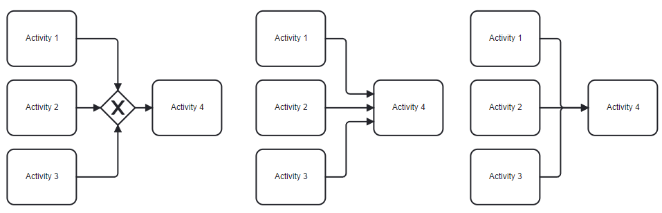 Different ways of connecting flows in BPMN. All three diagrams show the same logic.