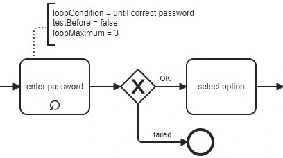 Standard loop notation is more compact than going back with a gateway, but all details are hidden in activity attributes. You can show them by attaching a comment to an activity.
