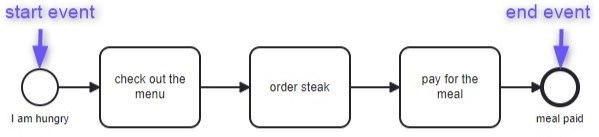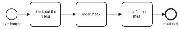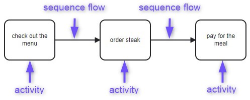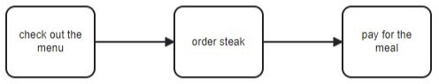 Sequence flows specify the logical order of a process. In this example I can’t order steak until the “check out the menu” is completed. There is a defined sequence of activities.