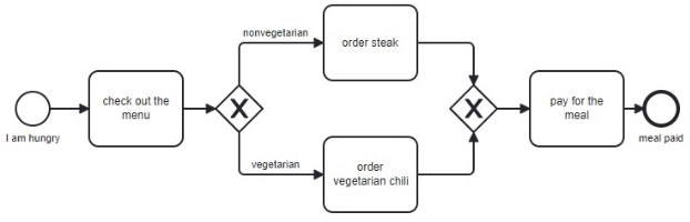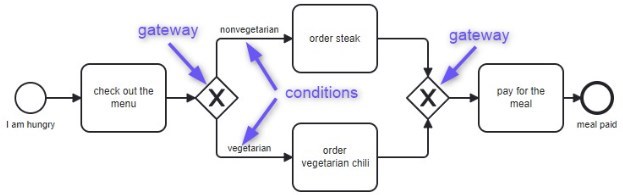 Gateways are used to control the splitting and merging of sequence flows within a Process. The first gateway (diverging) allows splitting the flow into two separate conditional flows - one of which can be chosen. I can order either a nonvegeterianGateways are used to control the splitting and merging of sequence flows within a Process. The first gateway (diverging) allows splitting the flow into two separate conditional flows - one of which can be chosen. I can order either a nonvegetarian meal or a vegetarian meal, but not both. Conditions specify which path can be taken. The second gateway brings flows back together.