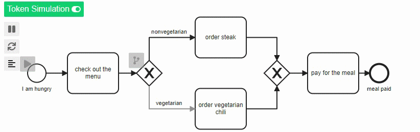 A token traverses the sequence flows and passes through the elements in the process. This simulation is powered by bpmn.io.